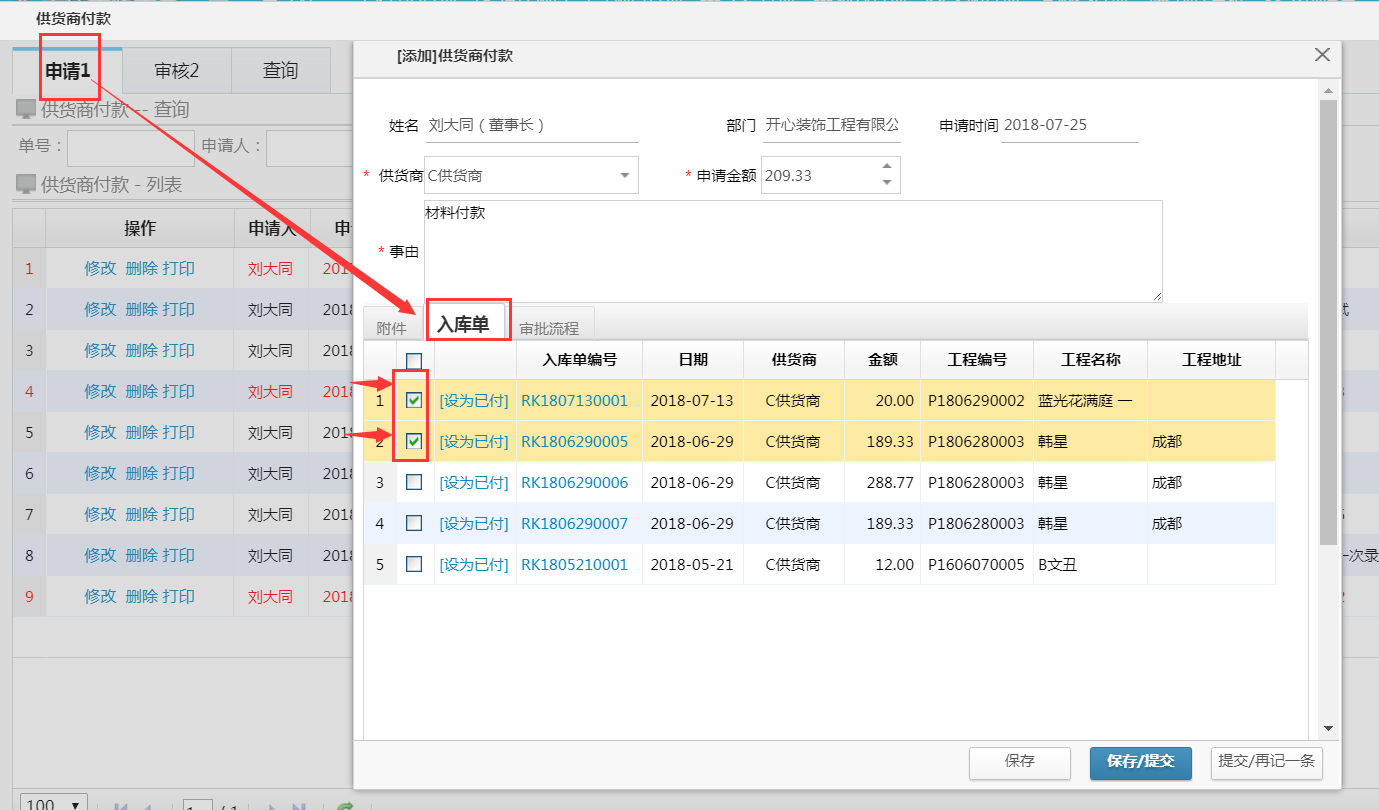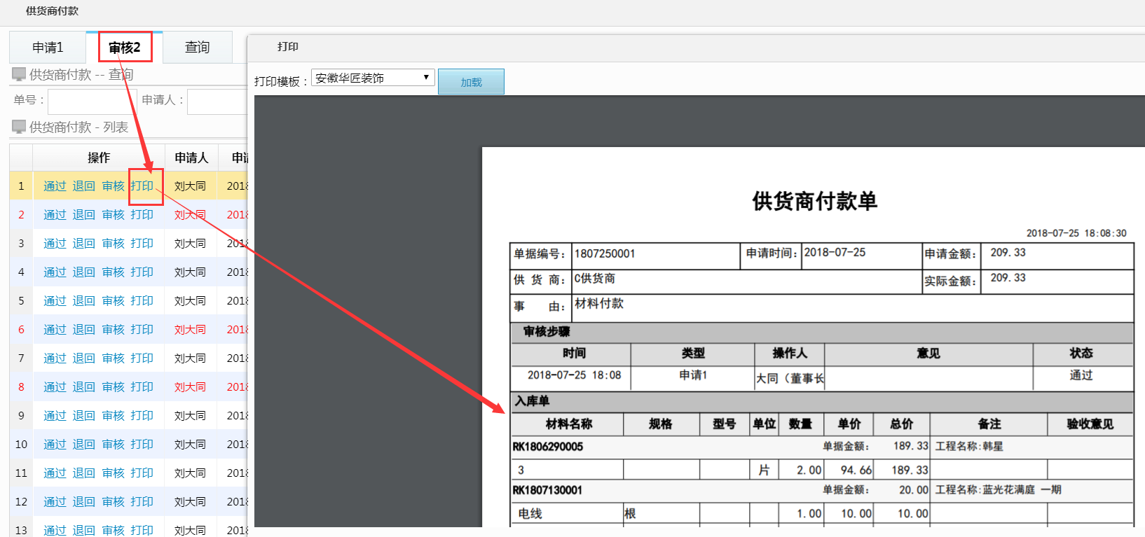 在打印時會將關(guān)聯(lián)入庫單的材料明細(xì)一起打印,如:入庫單有關(guān)聯(lián)工程這里將工程名稱也進行打印,沒有則不打印工程名稱;