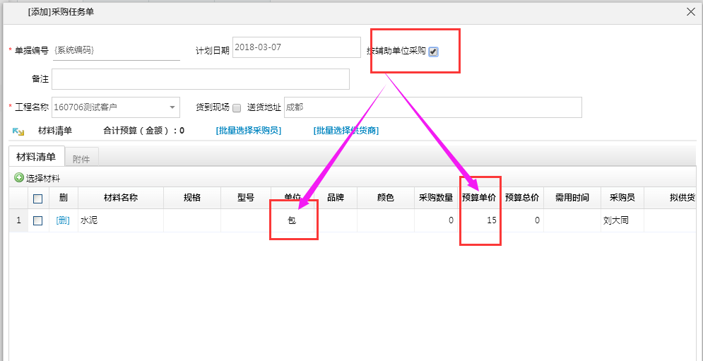 其次點開材料管理--采購任務(wù)單--選擇材料時注意勾選是否按輔助單位采購,具體請參考以下操作