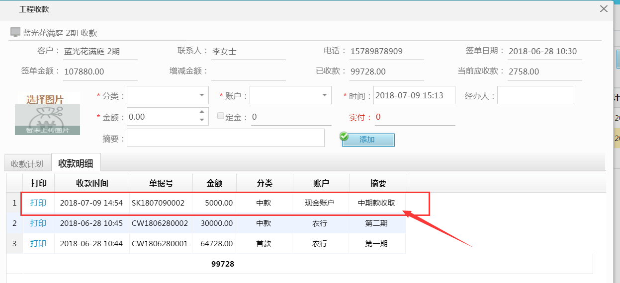 完成收款單的操作此數(shù)據(jù)會自動關(guān)聯(lián)到財(cái)務(wù)管理的工程收款形成收款明細(xì)