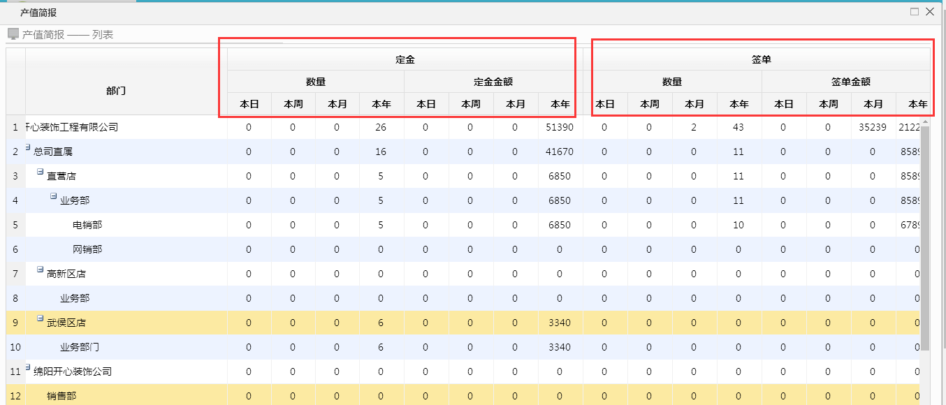 2:在此簡報(bào)中可直觀的查詢各部門業(yè)務(wù)員在各個(gè)時(shí)間段簽約客戶的定金和簽單匯總數(shù)量和總金額