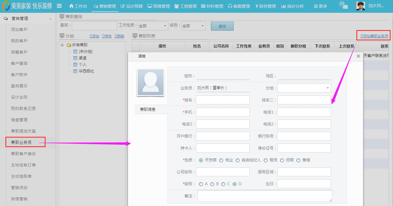 合作伙伴作為裝修公司的編外人員,一般是由本公司的業(yè)務(wù)員來跟進(jìn),近期優(yōu)化了兼職業(yè)務(wù)員的相關(guān)功能,更多強(qiáng)大的功能盡在美佳。