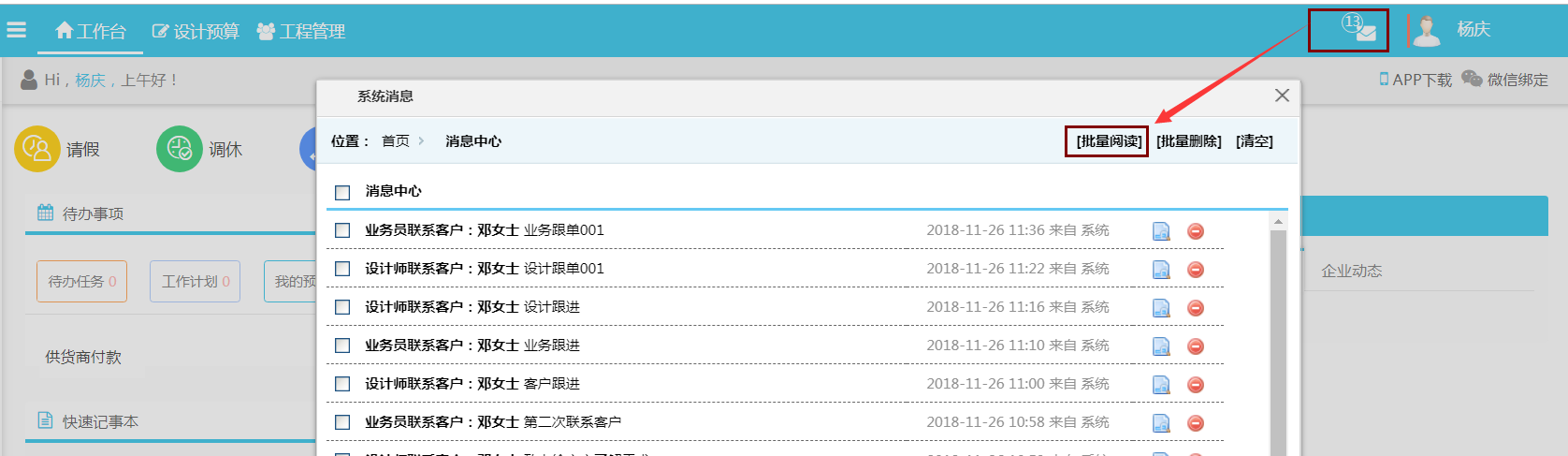 2、消息中心可查看有史以來(lái)所有的工作提醒消息,所有內(nèi)容一目了然,快速查漏自己未完成的工作。同時(shí)新增批量閱讀的功能,已閱讀的信息便可進(jìn)行勾選,使之從未閱讀數(shù)量中自動(dòng)過(guò)濾