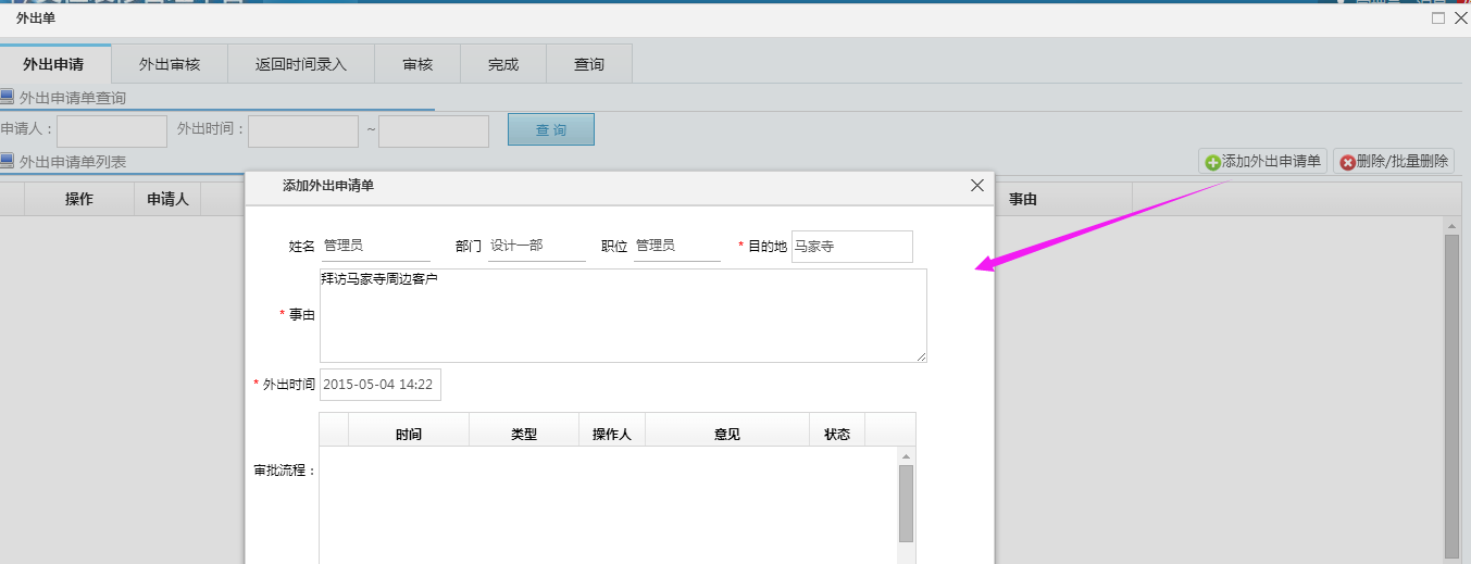 美佳裝飾管理軟件工作流程新增美佳裝飾管理軟件工作流程模塊新增外出單,方便記錄外出人員的外出和返回時間,查詢一段時間內(nèi)的外出記錄。審批流程可在系統(tǒng)設(shè)置—工作流管理中自行設(shè)置。