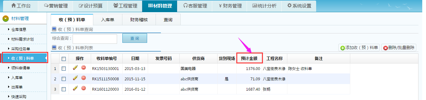 美佳裝飾管理軟件 材料管理入庫單新增合計(jì)金額顯示。在“材料管理”—》“收(預(yù))料單”中,系統(tǒng)新增單據(jù)合計(jì)金額顯示。如下圖所示,該功能的上線有效避免材料采購人員重復(fù)錄單的情況。